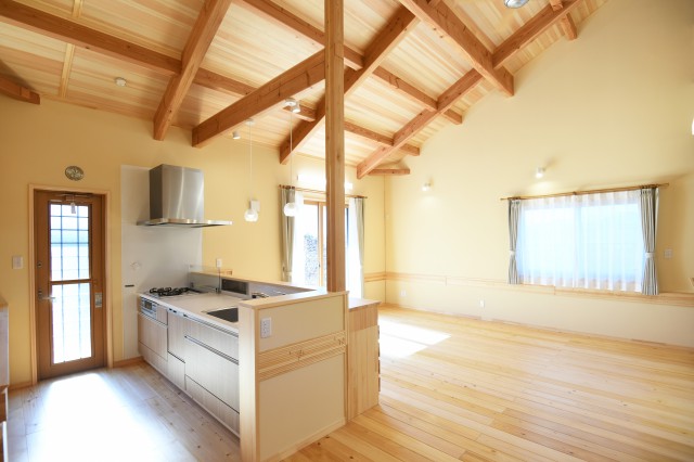 キッチンまわりもすべて無垢材を使用したことが特徴。 年数を重ねた風合いが楽しみになる1棟。